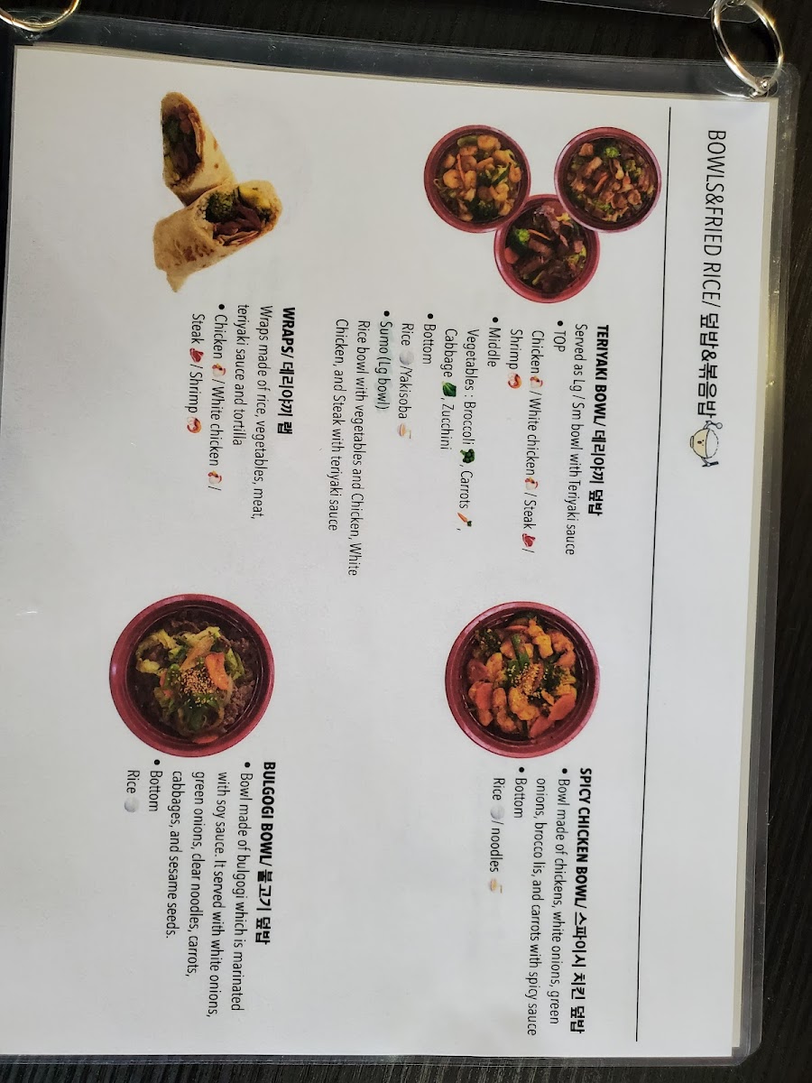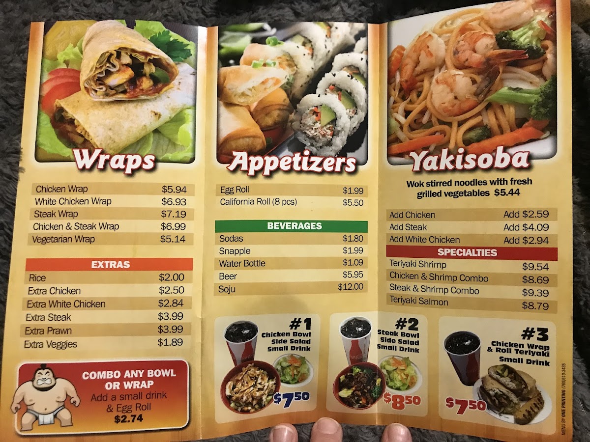 all of our bowls are made to order and served over a bed of rice with fresh wok-stirred veggies and sam's famous teriyaki sauce, veggie, chicken, steak, chicken, steak (brown rice also available)